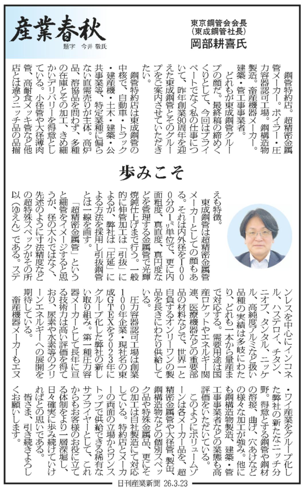 日刊産業新聞(産業春秋):当社岡部耕喜社長の記事が掲載されました。